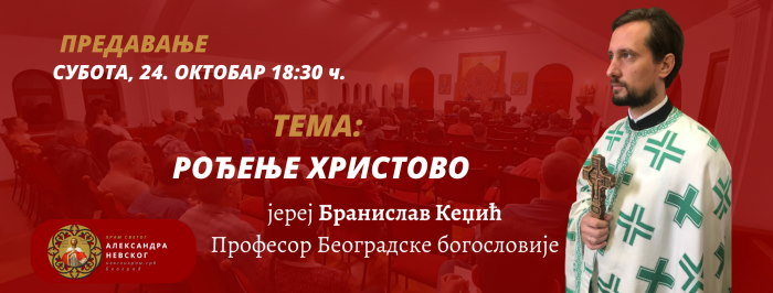 У суботу 24. октобра у 18: 30 часова у великој сали парохијског дома храма Светог Александра Невског наставља се циклус тумачења Светог Писма. Тема је „Рођење Христово“, а предавач је презвитер Бранислав Кеџић, професор Београдске богословије. Улаз слободан.