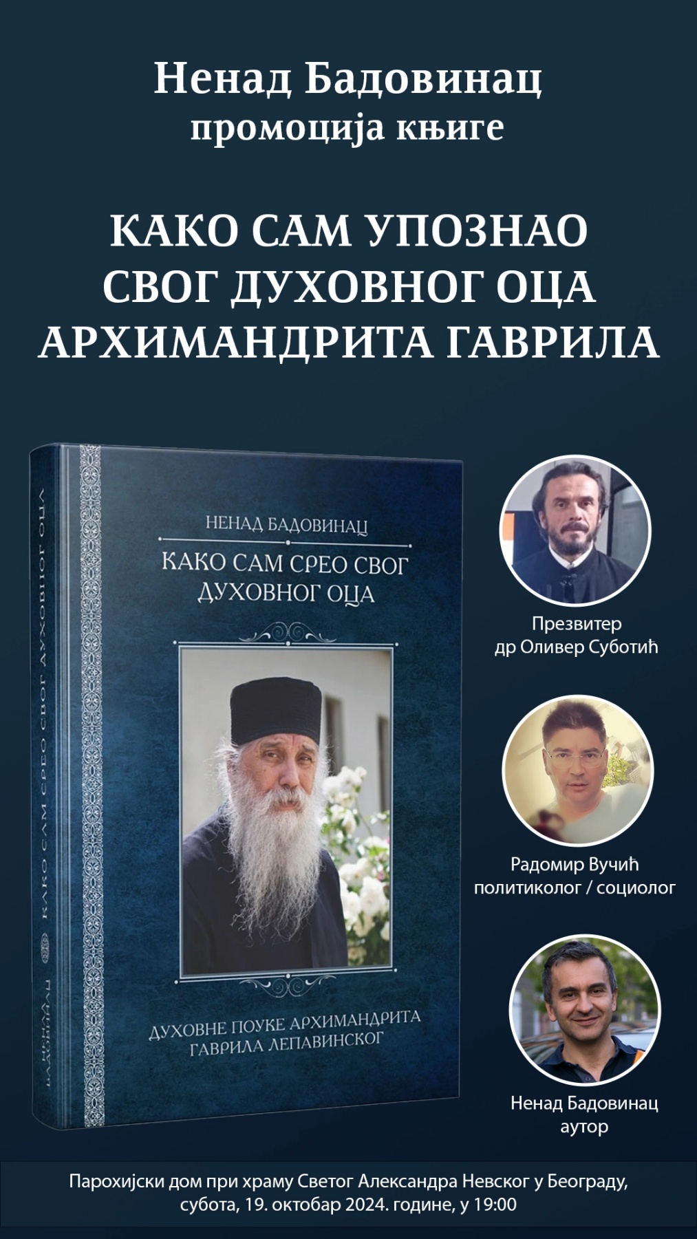 Позивамо Вас да присуствујете промоцији књиге „Како сам срео свог духовног оца – архимандрита Гаврила (Вучковића)“, аутора Ненада Бадовинца. На промоцији ће, уз аутора књиге, говорити и: презвитер др Оливер Суботић, који ће поделити своја искуства сусрета са архимандритом Гаврилом, и Радомир Вучић, социолог и духовно чедо оца Гаврила, који ће нам пренети своја сећања на свог духовног оца.