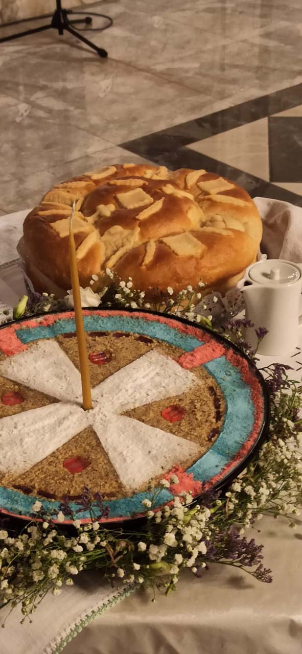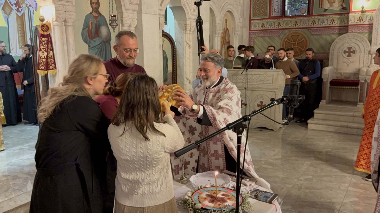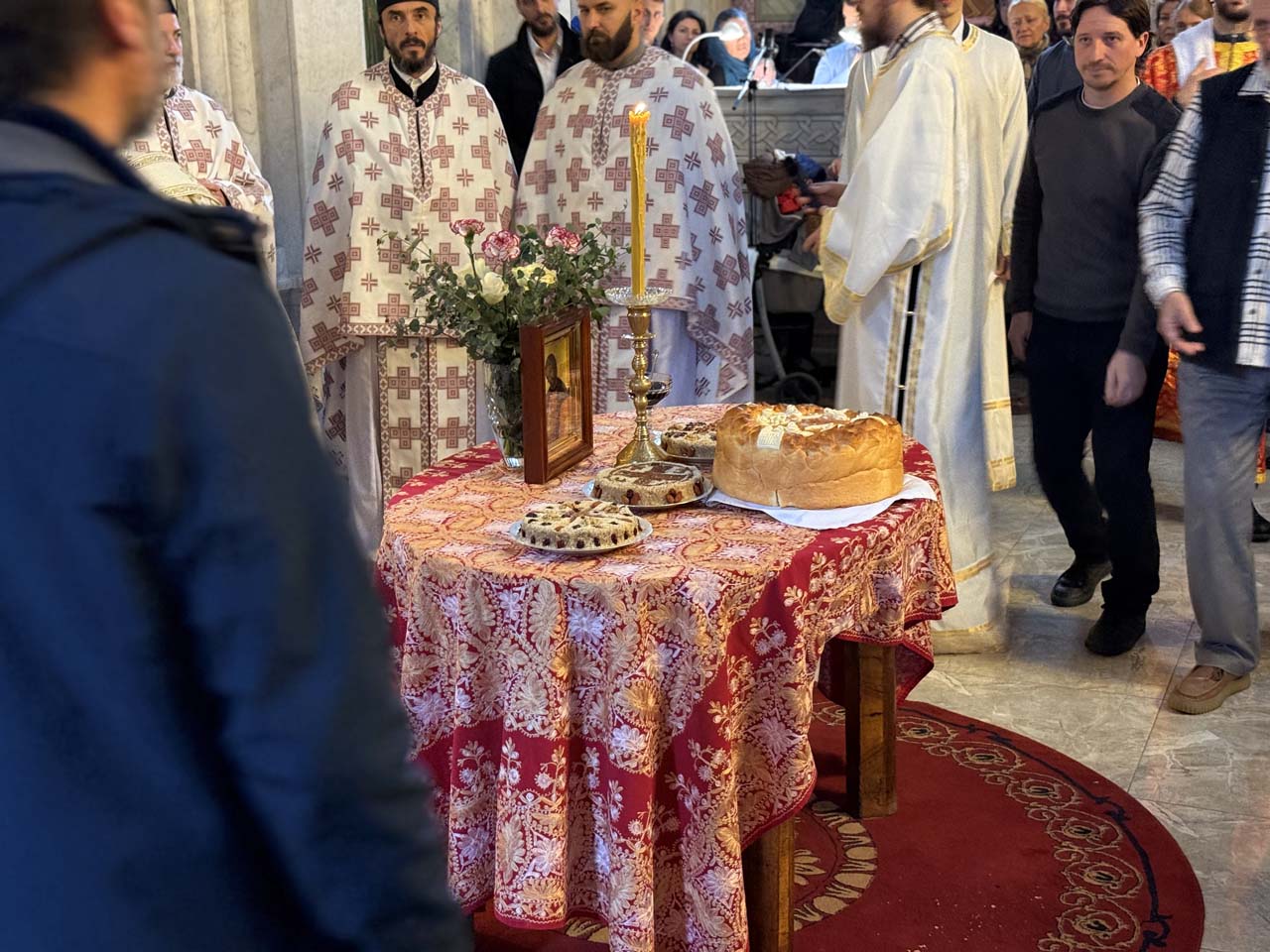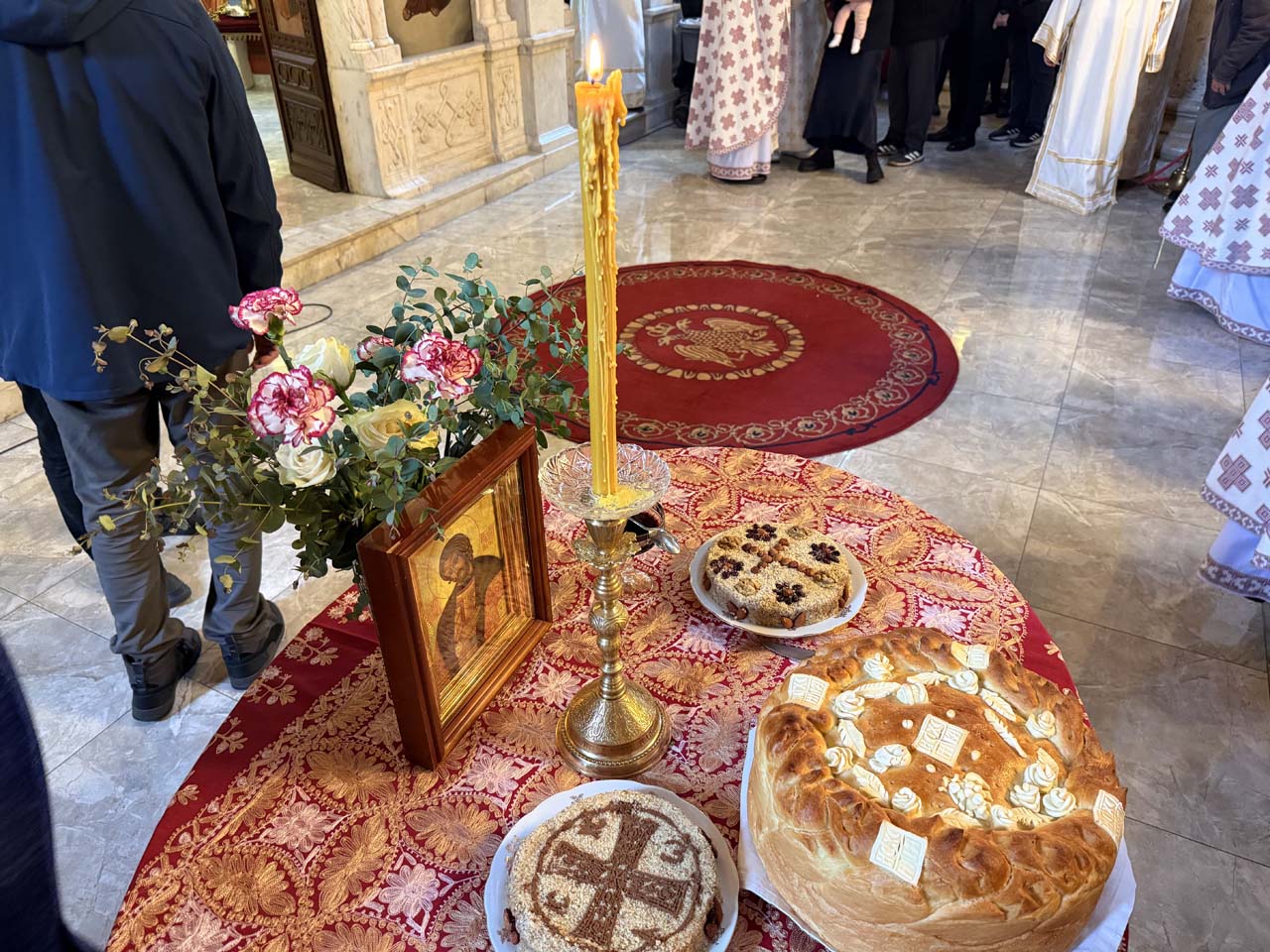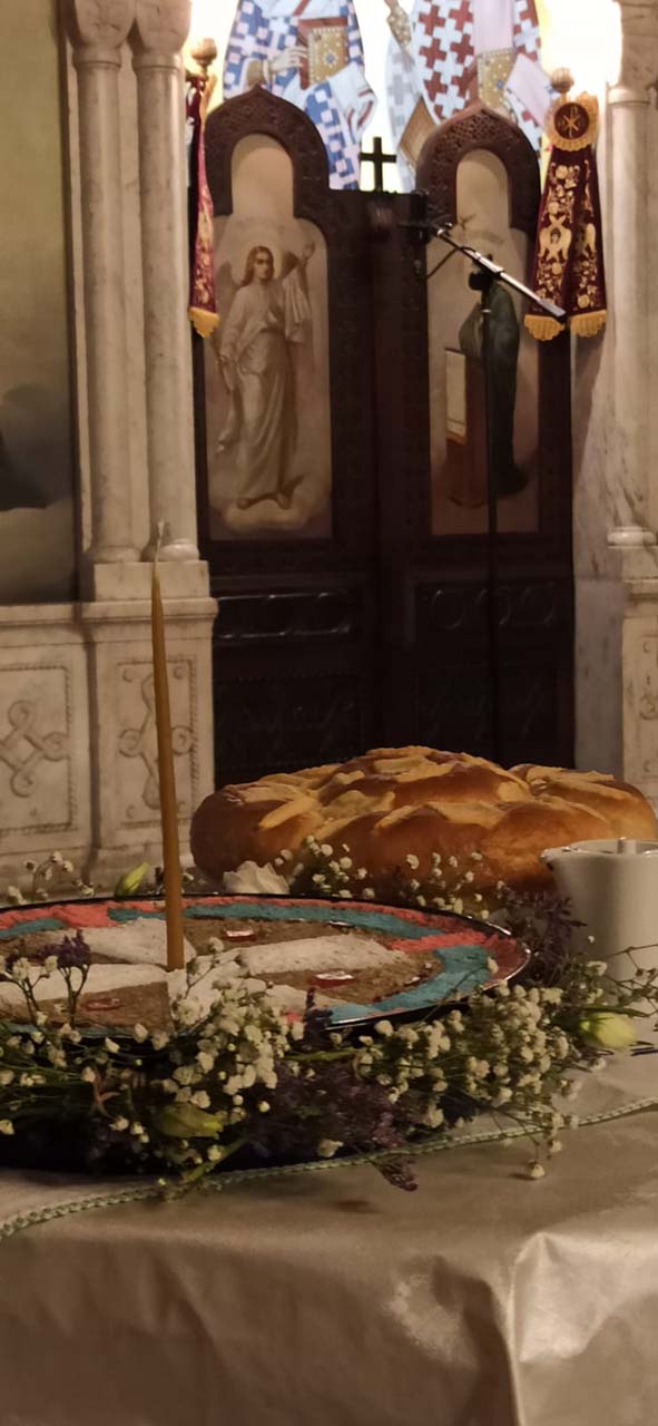 На вечерњем богослужењу, после Акатиста Светоме – преломљен је и славски колач и освештани славски дарови.