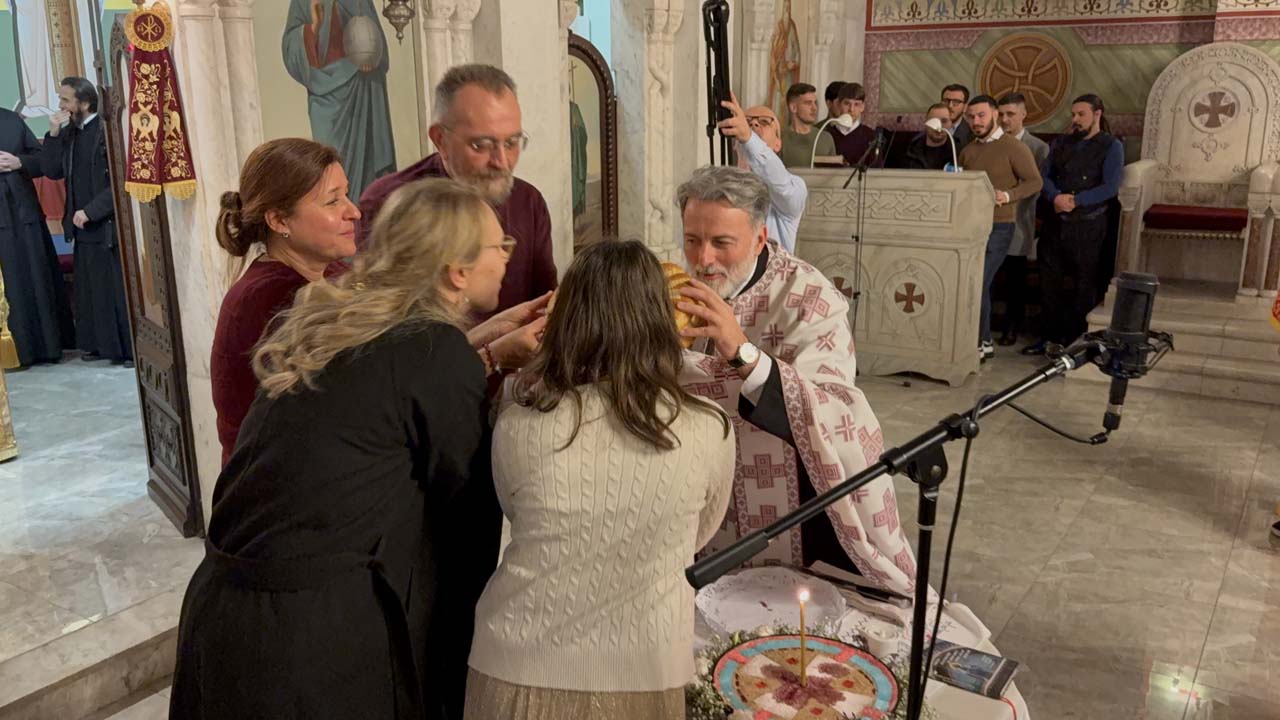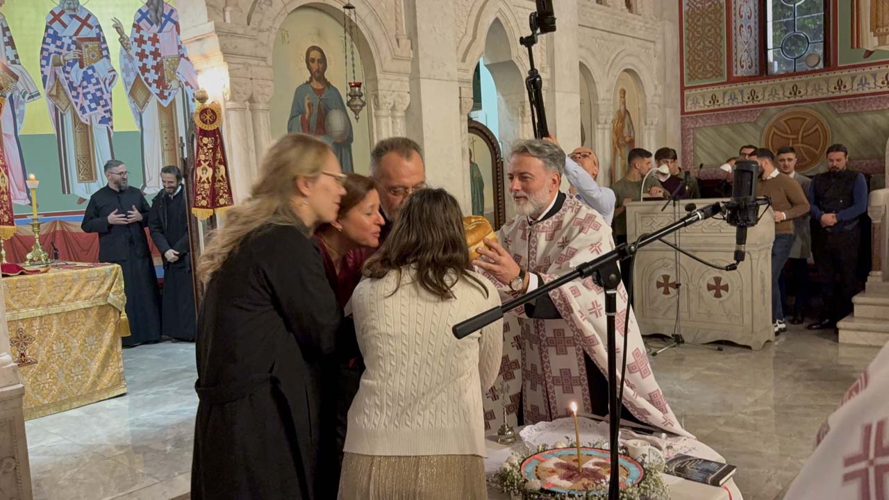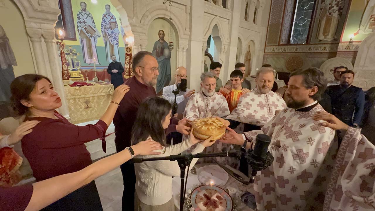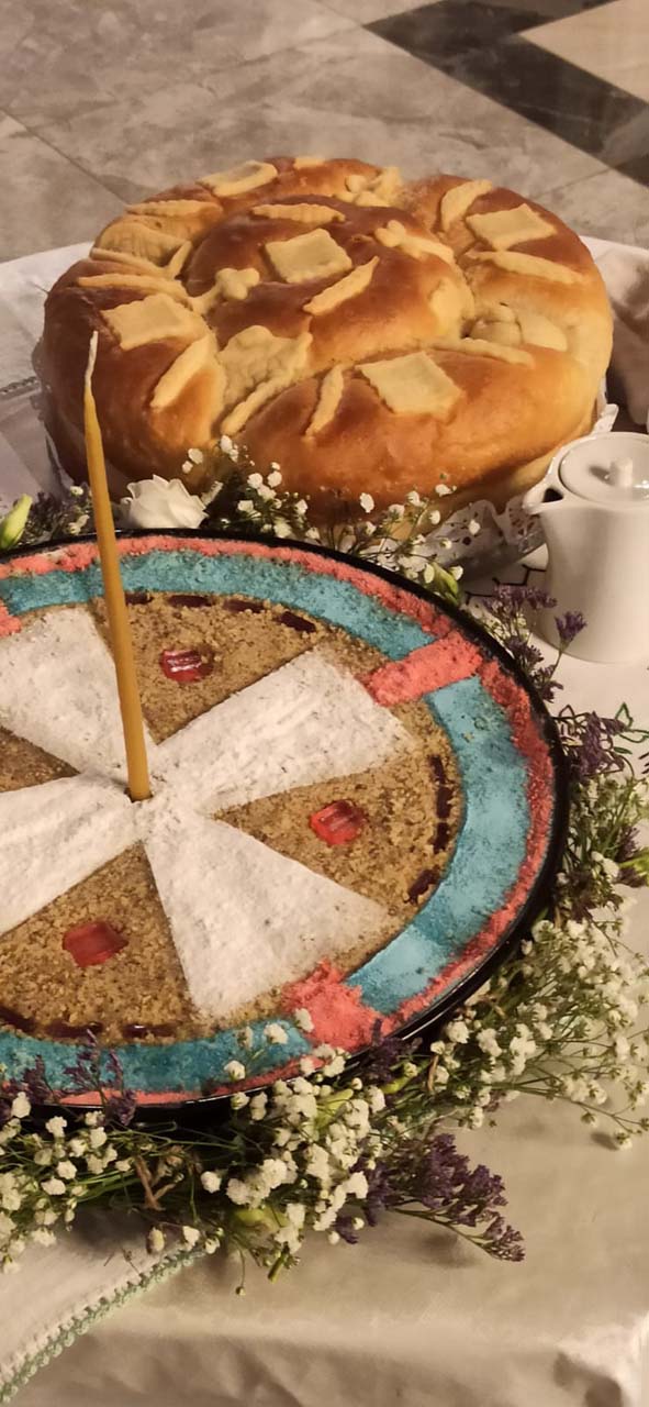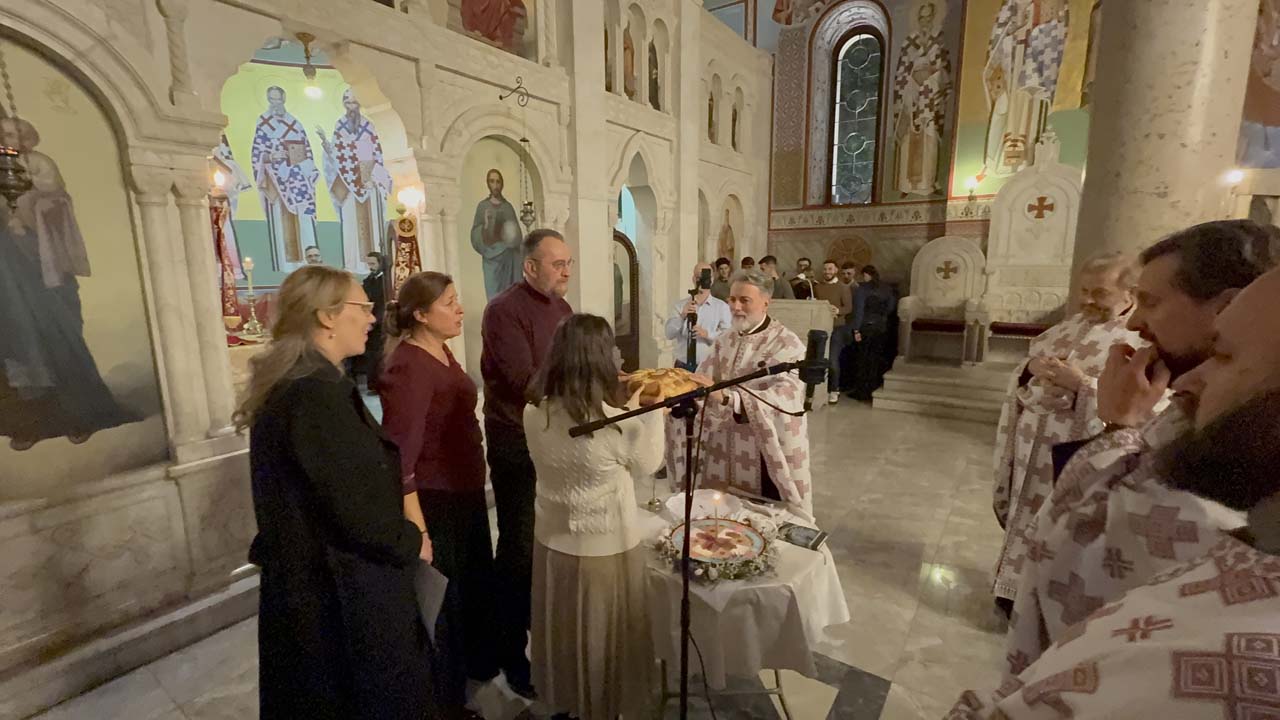 На вечерњем богослужењу, после Акатиста Светоме – преломљен је и славски колач и освештани славски дарови.