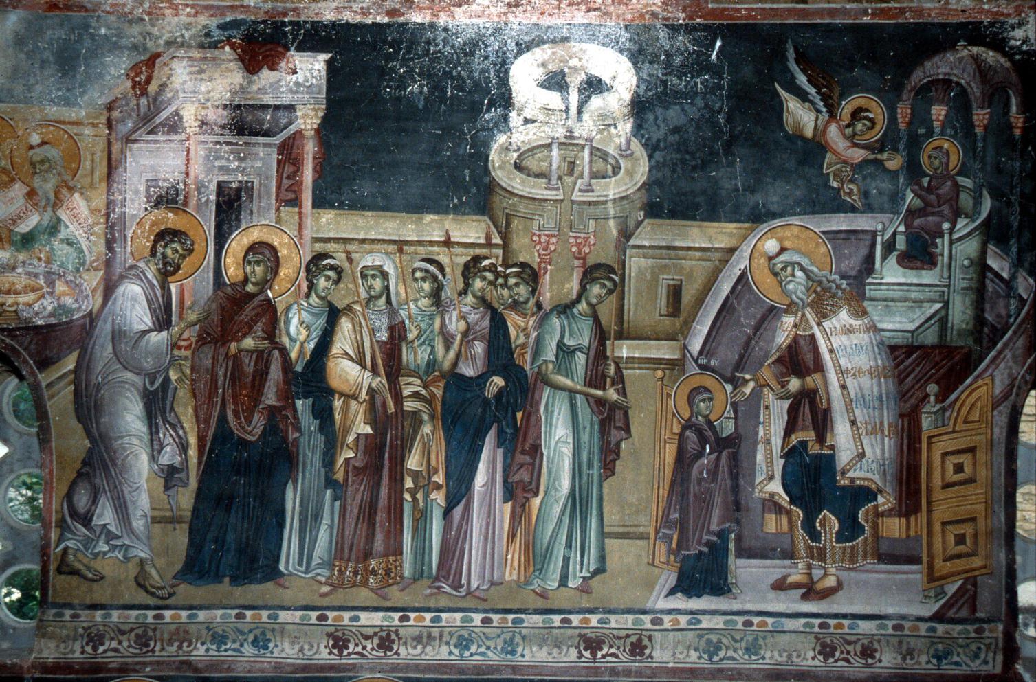 „У привремену Светињу над светињама ушла је вечна Светиња над светињама. Ушла је нерукотворена скинија слова, разумни и живи кивот хлеба живота који је ради нас уистину сишао с небеса, ушла је тамо где се налазио људским рукама начињени кивот у којем се чувао сасуд са маном, сачињеном од јутарње росе што је стваралачком и божанском вољом претворена у храну. Будући да је мана ниспослана с небеса, несавршени и непосвећени у истинске божије тајне назвали су је „хлебом ангелским“, док се онима што су сазнали божанско и проникли у божанског Духа она показала као праобраз будуће истине која ће се испунити у овој Дјеви. Ушла је Књига живота, у којој нису била исписана обличја слова, него је само неизрециво Слово Оца небеског носила у себи. Ушла је тамо где су се чувале таблице Завета, на којима су беживотна обличја слова била изображена. Ушао је вечноцветајући изданак, од којег је произашао неоскврњени Цвет и подарио нам нетрулежност, ушла је тамо где се налазило жезло Аароново које је, будући суво, процветало, предизображавајући бесемено рођење од Дјеве.”